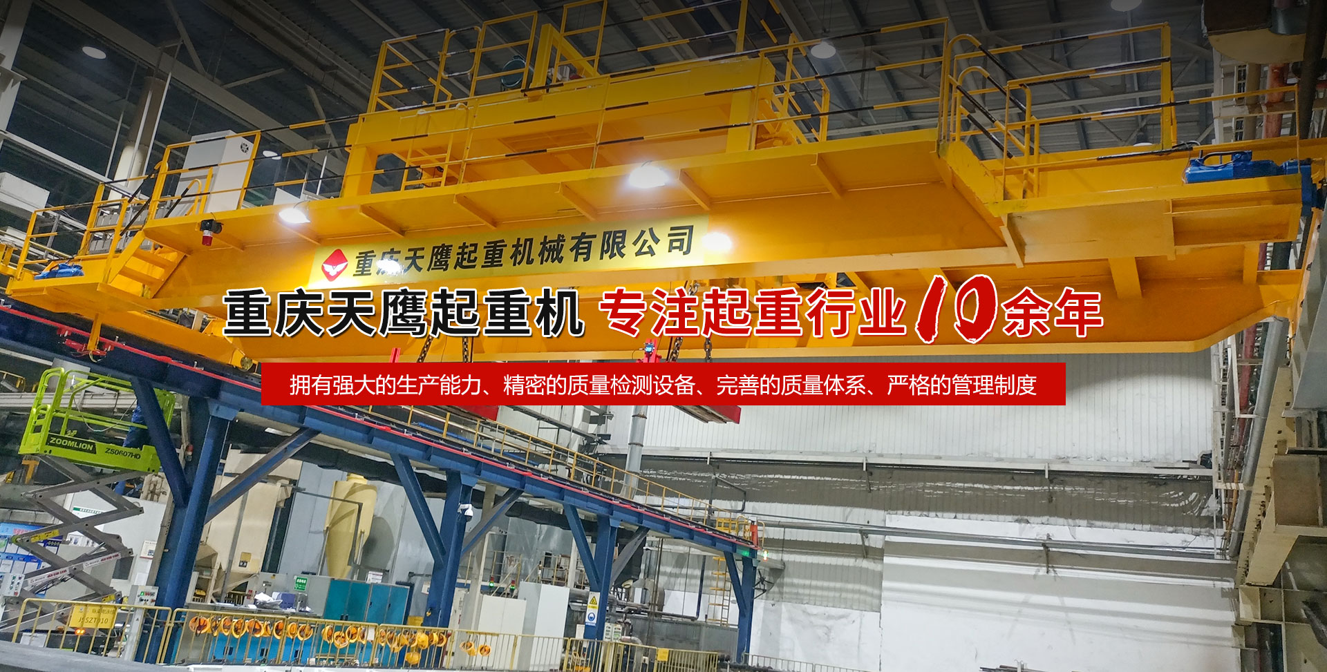重慶天鷹起重機(jī)械有限公司成立于2014年,主營(yíng)起重機(jī)的銷售、安裝和維護(hù)等相關(guān)服務(wù)。中國(guó)重型機(jī)械工業(yè)協(xié)會(huì)員單位、為中國(guó)工程機(jī)械工業(yè)協(xié)會(huì)工程機(jī)械維修分會(huì)會(huì)員單位及西南地區(qū)起重機(jī)械定點(diǎn)安裝維修單位。具有國(guó)家質(zhì)量監(jiān)督檢疫總局頒發(fā)的特種設(shè)備安裝維修改造質(zhì)格證書。并率先通過(guò)了IS09001-2000質(zhì)量體系認(rèn)證。  公司注冊(cè)資金3000萬(wàn)元;廠房面積2萬(wàn)平方米;各種生產(chǎn)檢測(cè)設(shè)備50臺(tái)套,公司技術(shù)力量雄厚,聘請(qǐng)了國(guó)內(nèi)知名起重機(jī)專家、工程技術(shù)人員擔(dān)當(dāng)項(xiàng)目經(jīng)理、技術(shù)總工程師及顧問(wèn)。現(xiàn)擁有員工100多人,其中工程技術(shù)人員12人。  主導(dǎo)產(chǎn)品為各類橋、門式起重機(jī)及輕小型起重設(shè)備,具備生產(chǎn)起重量200t及以下通用橋、門式起重機(jī)的能力,尤其在200t以下起重機(jī)產(chǎn)品上具備較強(qiáng)的市場(chǎng)競(jìng)爭(zhēng)力,為許多行業(yè)設(shè)計(jì)制造了技術(shù)含量高、技術(shù)性強(qiáng)的起重設(shè)備,許多產(chǎn)品在原設(shè)計(jì)標(biāo)準(zhǔn)上進(jìn)行了較大的改進(jìn)、優(yōu)化和創(chuàng)新;其中NH型系列電動(dòng)葫蘆、HD型電動(dòng)單梁處于國(guó)內(nèi)高水平.....  好的產(chǎn)品品質(zhì)需要由較高的裝備水平來(lái)保證,公司購(gòu)買了“大型數(shù)控落地鏜”、“數(shù)控切割機(jī)床”、“自調(diào)式焊接滾輪機(jī)”、“數(shù)顯液壓板料折彎?rùn)C(jī)”、“超大型數(shù)控臥式車床”、“數(shù)控液壓水平下調(diào)式三輥卷板機(jī)”、“單柱移動(dòng)式立式車床”“擁有用于單梁生產(chǎn)的全國(guó)一條拋丸噴漆烘干線、葫蘆噴漆烘干線和全國(guó)較大的100T葫蘆試驗(yàn)臺(tái)和檢測(cè)中心”等各種先進(jìn)的加工設(shè)備,新建廠房面積近2萬(wàn)平方米。  質(zhì)量是企業(yè)的生命,天鷹公司依據(jù)“ISO 9001國(guó)際質(zhì)量管理體系”標(biāo)準(zhǔn),制定并完善了公司的質(zhì)量管理體制。堅(jiān)持質(zhì)量體系的內(nèi)審和外審,將質(zhì)量管理工作落實(shí)到企業(yè)生產(chǎn)經(jīng)營(yíng)的全過(guò)程。  您的微笑,是天鷹永恒的追求;天鷹的服務(wù),是您首要的選擇!因?yàn)槲覀儓?jiān)信:“誠(chéng)信是本、質(zhì)量鑄就品牌”。為您服務(wù)是我們的榮耀,勤奮而進(jìn)取的天鷹人,時(shí)刻期盼著您的到來(lái)。